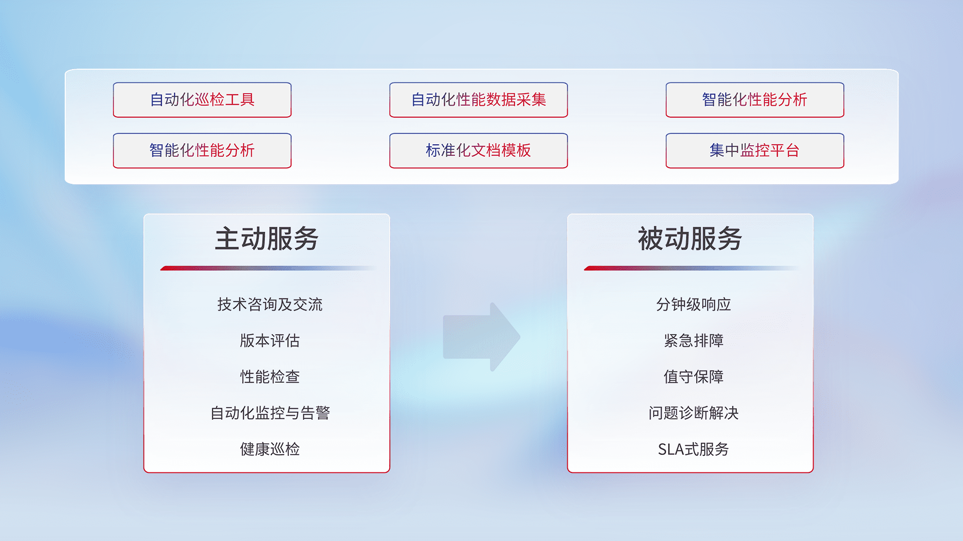 智能化工具和标准化文档,,,保障服务质量,,,提供主动服务(包含技术咨询、、、、版本评估、、、、性能检查、、、自动化监控与告警、、健康巡检)和被动服务包含(分钟级响应、、、、紧急排障、、、、值守保障、、、问题诊断解决、、、SLA服务)。。